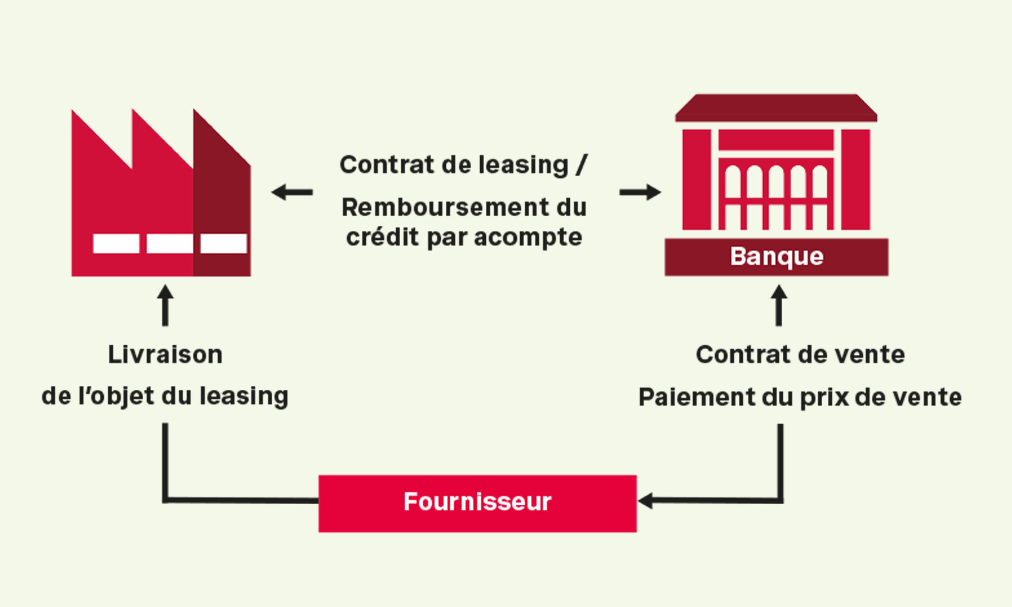 Vous acquérez des machines, des véhicules, des appareils ou des équipements entièrement au travers de fonds étrangers. La banque achète les biens auprès du fournisseur et vous les met à disposition contre le paiement d’acomptes définis sur une certaine durée.