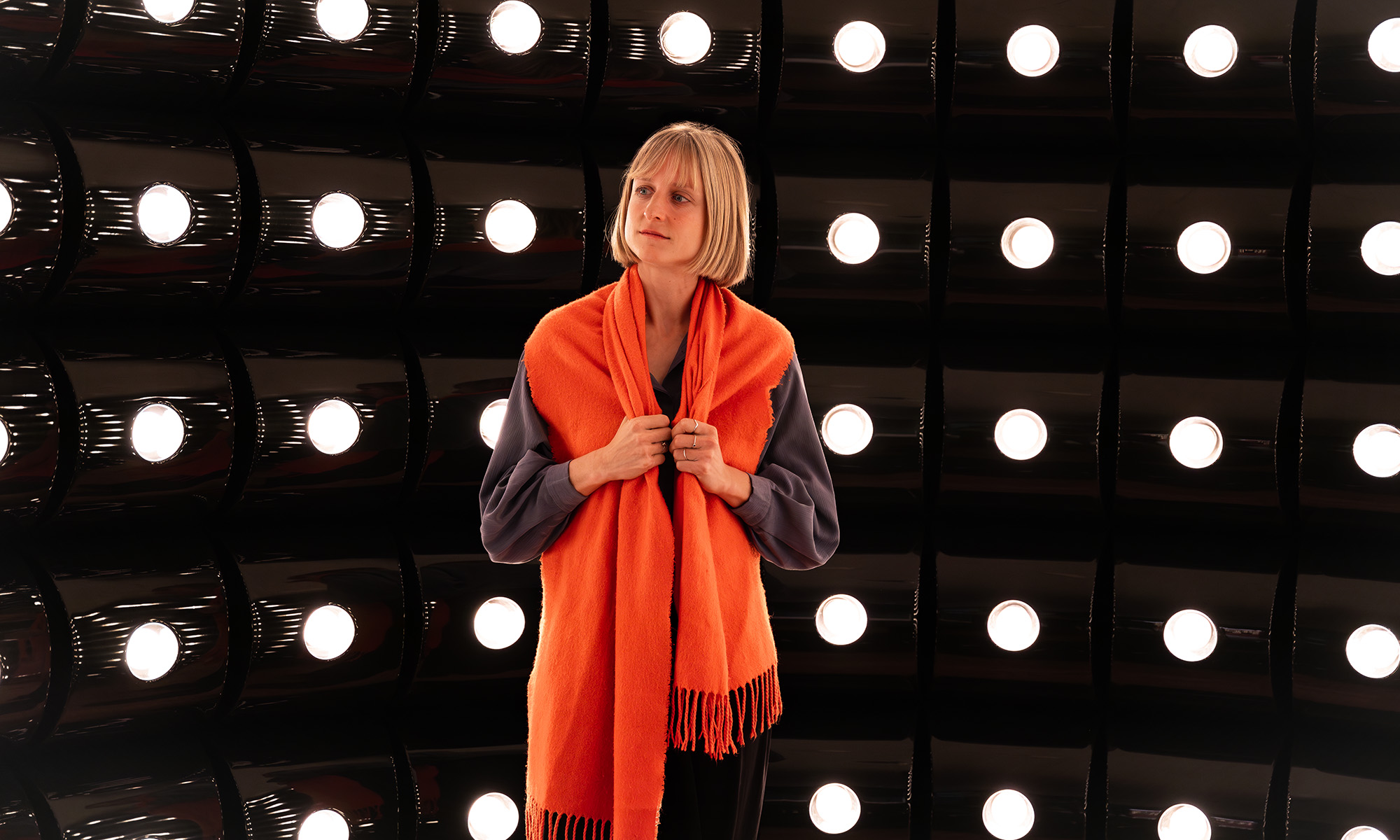 La curatrice Katrin Sperry au cœur d’une installation artistique dans le vestibule de la salle des coffres du site de la BCBE à Bienne.