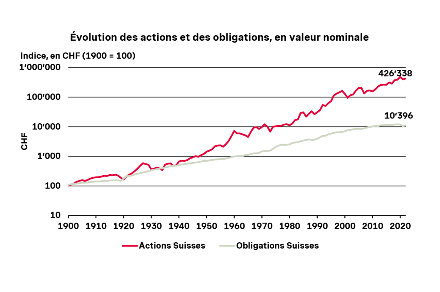 En effet, entre 1900 et 2023, l’indice suisse du marché d’actions – le SMI (Swiss Market Index) – a augmenté, même s’il a accusé quelques revers. Les investisseurs qui ont misé sur des actions suisses durant cette période-là ont bénéficié de cette hausse. En effet, avec un investissement de 100 francs en 1900, ils auraient gagné environ 426 000 francs en 2023!