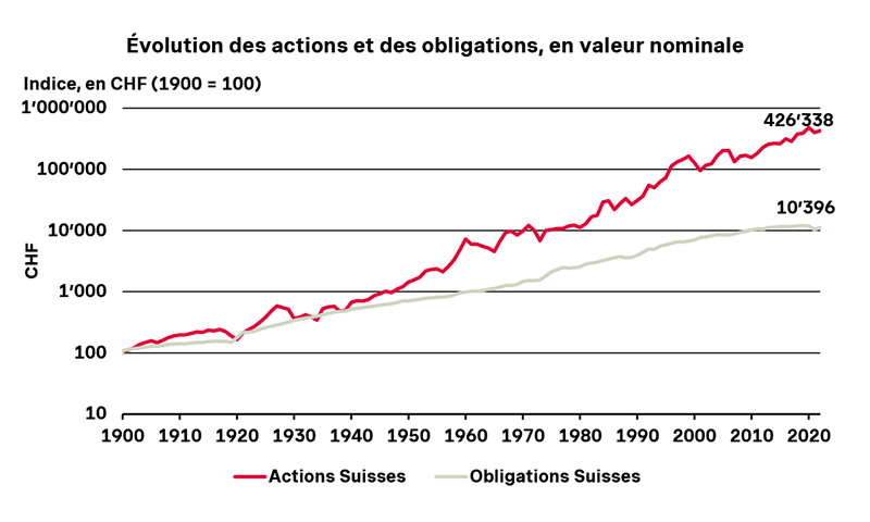 L’indice boursier suisse n’a cessé de grimper entre 1900 et 2023, mis à part quelques reculs ponctuels. Les investisseurs qui auraient investi dans des actions suisses pendant toute cette période auraient décuplé leur fortune. En effet, avec un placement 100 francs en 1900, ils auraient gagné environ 426 000 francs en 2023! En revanche, le même placement dans des obligations en francs suisses aurait rapporté «seulement» 10 000 francs.