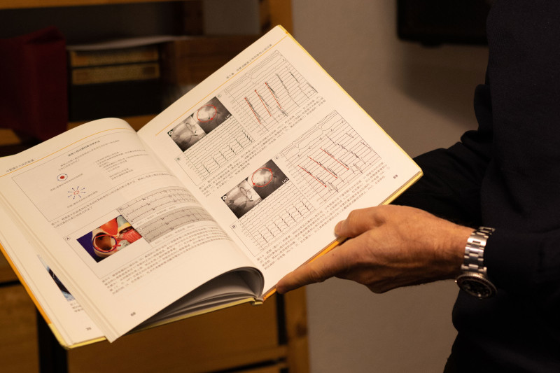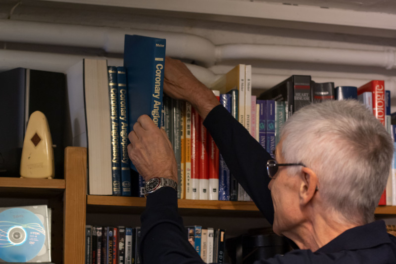 Berni s’appuie contre l’étagère. Une bonne partie des livres qu’elle contient sont de sa plume et ont été traduits dans de nombreuses langues. « Il fut un temps où ce livre se trouvait dans presque tous les cabinets des cardiologues du monde entier qui traitaient la maladie coronarienne », explique-t-il en ouvrant un livre intitulé « Coronary Angioplasty ». « J’imagine qu’il est aujourd’hui épuisé. Les heureux propriétaires sont probablement tous retraités. » Sur la première page figure la dédicace « To my wife Monika ».