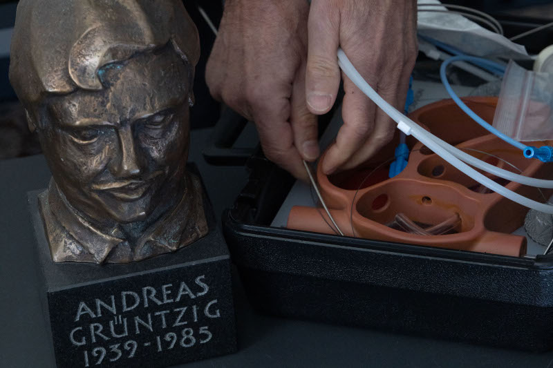 angle de la pièce. Le signe d’un lien profond. « Professionnellement, je lui dois tout », confie le médecin en s’asseyant près de la sculpture. En 1976, Andreas Grüntzig a inventé une méthode révolutionnaire pour traiter la maladie coronarienne, la cause de décès la plus fréquente. « Je l’ai suivi dès le début de l’aventure », raconte Berni. En septembre 1977, Grüntzig réalise pour la première fois une intervention avec la technique qu’il a lui-même développée : la dilatation par ballonnet d’un rétrécissement d’une artère coronaire. L’opération est un succès et le patient vit d’ailleurs toujours aujourd’hui. « Tous ceux qui ont assisté à cette petite révolution se réunissent depuis chaque année pour fêter l’événement. » Malheureusement, depuis fort longtemps sans Andreas Grüntzig, car le célèbre cardiologue a perdu la vie dans un accident d’avion à l’âge de 46 ans, moins de dix ans après sa formidable découverte. Mais sa technique est utilisée chaque jour pour sauver des centaines de milliers de patients dans le monde entier.