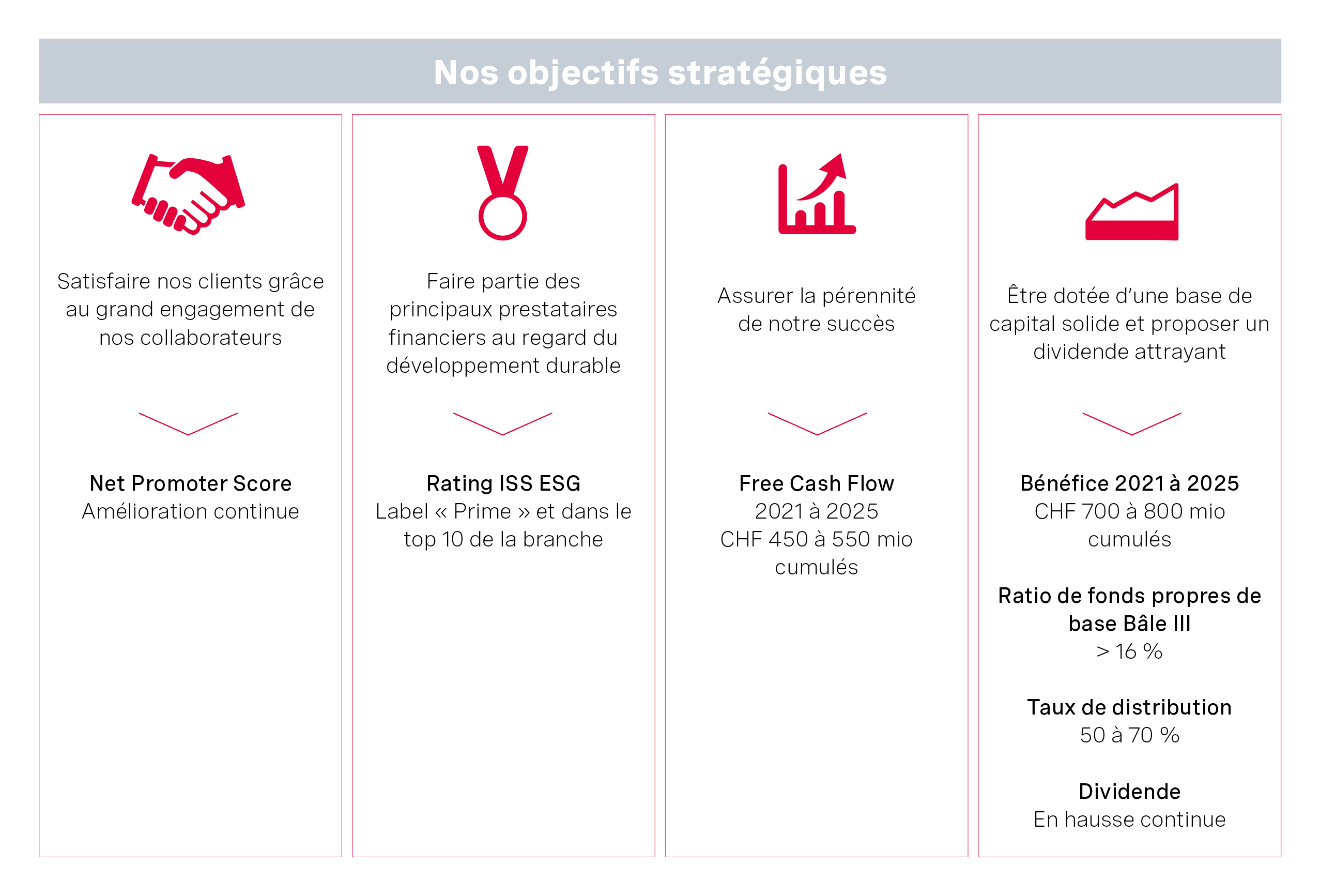 La BCBE met un point d’honneur à ce que ses clients puissent compter sur elle, à l’avenir également, en tant que prestataire de services financiers de premier plan dans son espace économique. Elle s’est fixé des objectifs ambitieux dans le but de susciter l’enthousiasme de sa clientèle, de ses collaborateurs ainsi que de ses actionnaires, de manière durable.
