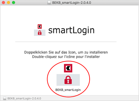 Ouvrez le fichier et démarrez l’installation par un double clic sur l’icône «BEKB smartLogin». Si votre système vous demande si vous souhaitez vraiment ouvrir «BEKB smartLogin», vous confirmez en appuyant sur «Ouvrir».