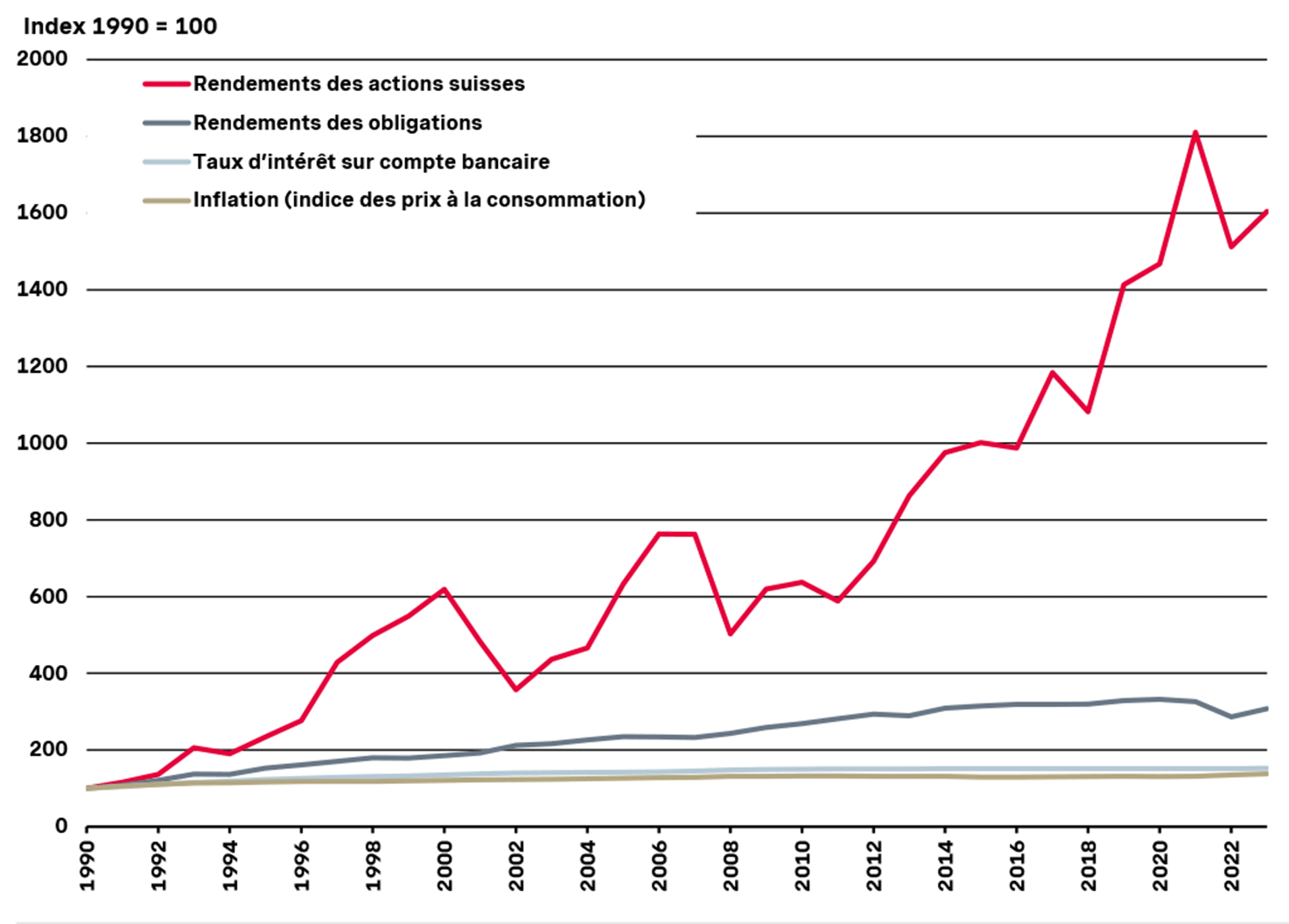 Au cours des dernières décennies, les investisseurs en actions, par exemple, ont vu la valeur de leurs placements augmenter sensiblement. Par contre, les personnes qui ont laissé leur argent sur un compte n’ont pas pu le protéger contre l’inflation et ont donc connu une baisse de leur pouvoir d’achat durant la même période.