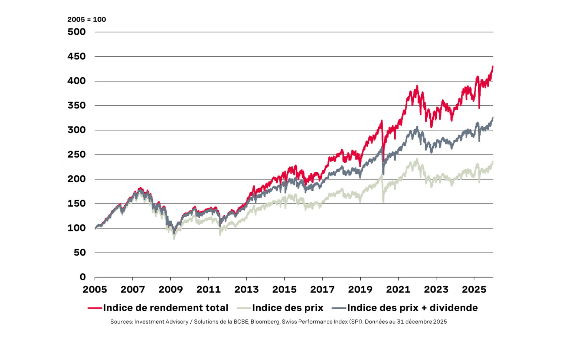 Les dividendes sont une source de revenu importante, surtout à long terme. Les investisseurs qui ont misé sur les actions suisses au cours des vingt dernières années ont engrangé un rendement annuel de 4,2% en moyenne. Ceux qui ont réinvesti les dividendes ont enregistré un rendement moyen de 7,2%, grâce à l’effet des intérêts composés, un atout en particulier lorsque l’horizon de placement est long. En effet, en réinvestissant les dividendes, les investisseurs perçoivent de nouveaux dividendes sur leur capital ainsi augmenté.