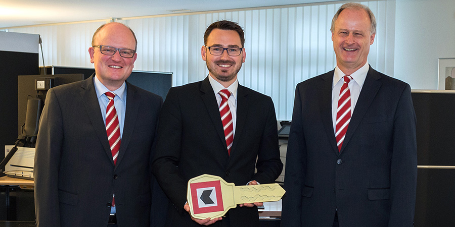 Peter Schmutz (à droite) remet la clé du siège de la BCBE de Langnau à son successeur Christian Röthlisberger. Dans l’image à gauche : le responsable de la région Emmental, Adrian Muster.