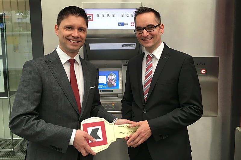 Christian Balmer (à gauche) remet la clé du siège de la BCBE d’Ittigen à son successeur, Marcel Zürcher.