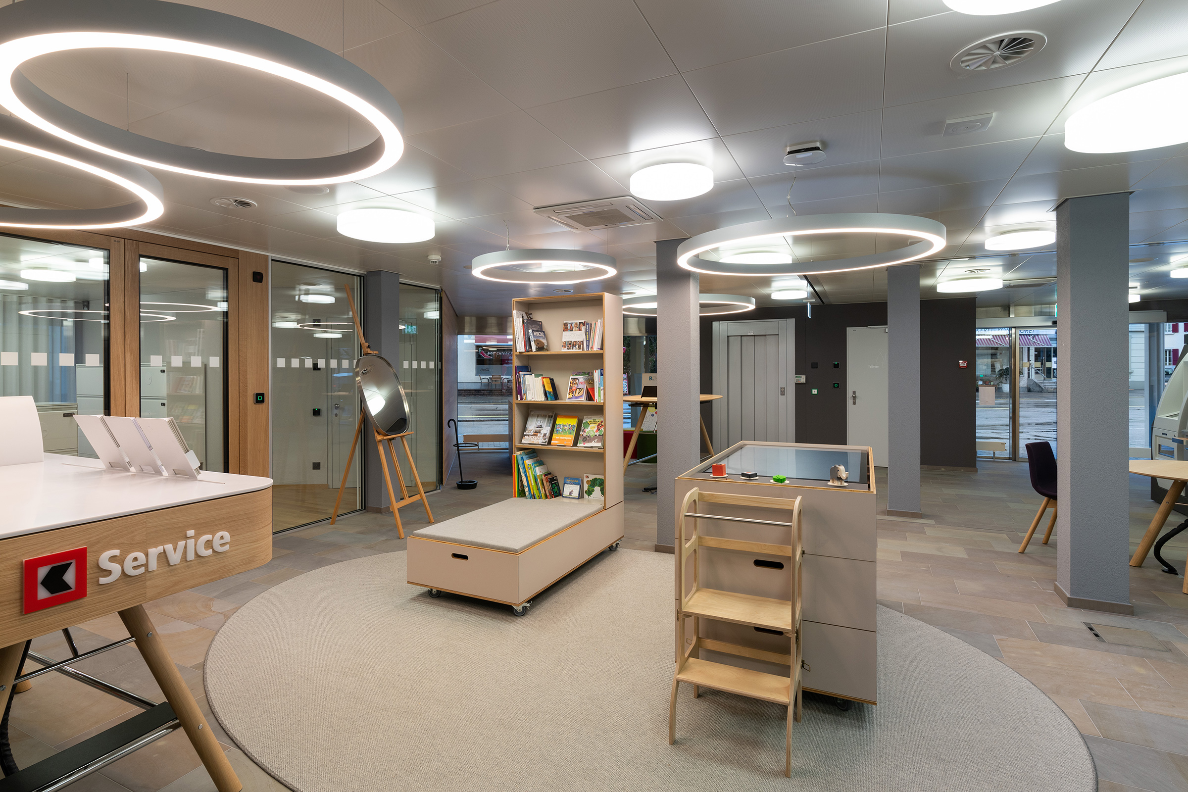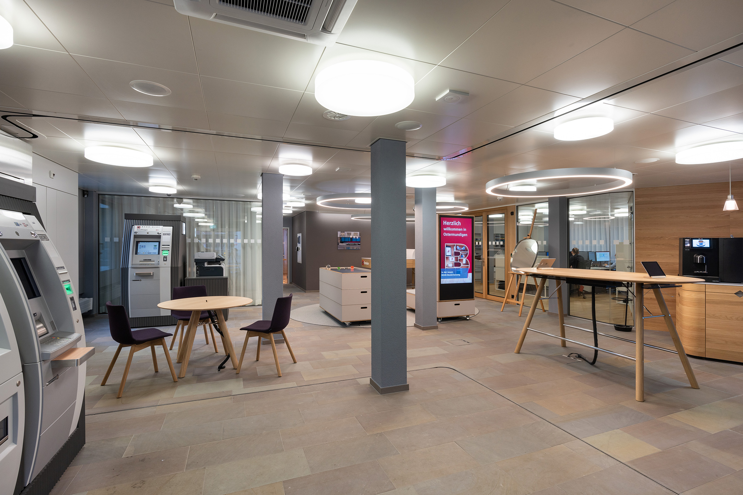 Le siège, modernisé, sera la vedette de la fête. Petits et grands pourront partir à la découverte des locaux fraîchement réaménagés. Ce lieu disposera notamment d’une zone en libre accès accessible en dehors des heures d’ouverture de la banque également, ce qui offre davantage de flexibilité aux clients et leur permet d’effectuer leurs opérations bancaires quand cela les arrange. À l’instar d’aujourd’hui, il sera possible de solliciter un entretien-conseil même en dehors des heures d’ouverture de la banque, soit entre 7h00 et 19h00. Daniela Suter, responsable du siège d’Ostermundigen, et son équipe sont enchantés à l’idée de « travailler dans des locaux ouverts et modernes. De plus, l’éclairage rend la zone clientèle plus spacieuse et plus accueillante. »