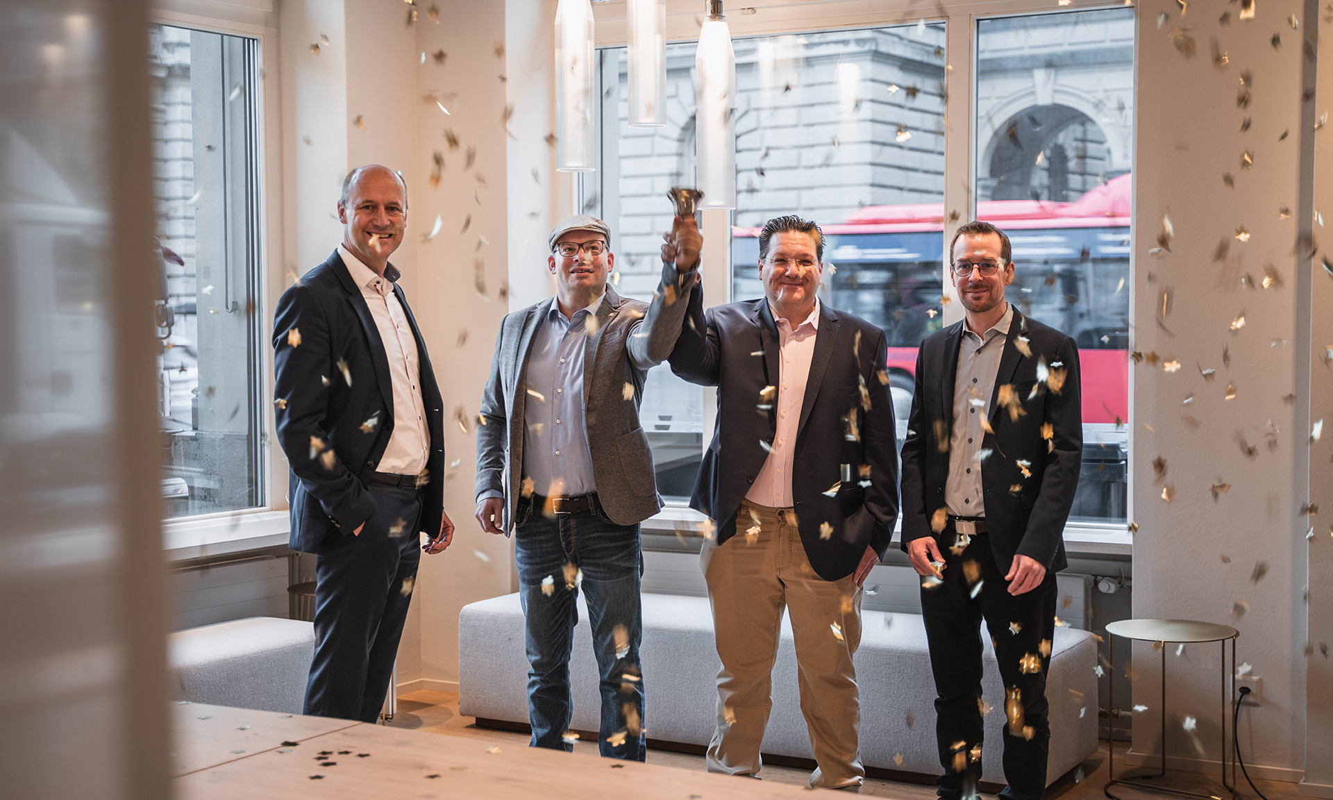 Armin Brun (CEO de la BCBE), Stefan Kaemper et Boris Obodda (cofondateurs de Cow Level AG), Andreas Langenegger (SME|X)