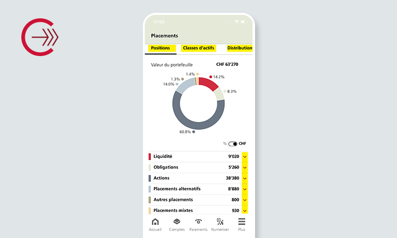 L'espace de placement numérique vous offre un aperçu compréhensible et complet de votre portefeuille, réparti par positions, classes d'actifs et répartition monétaire.