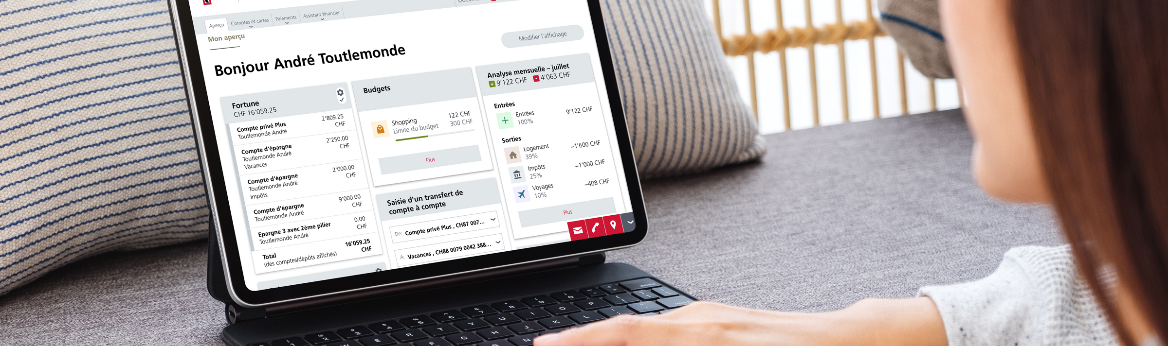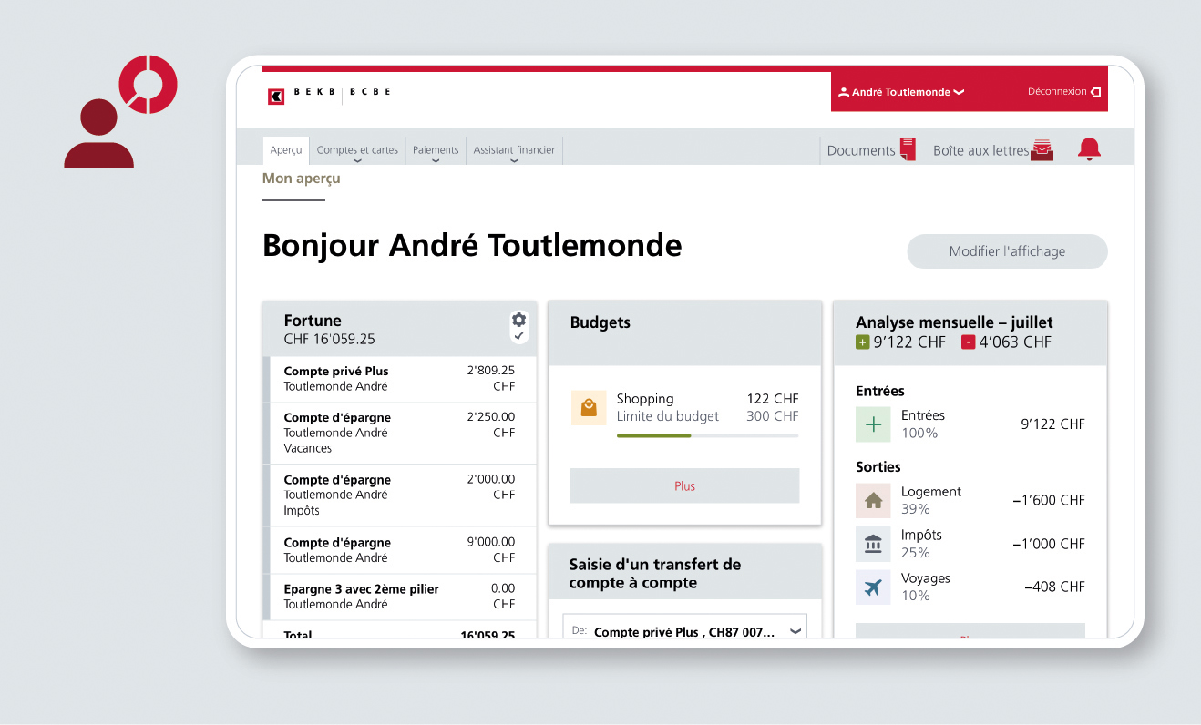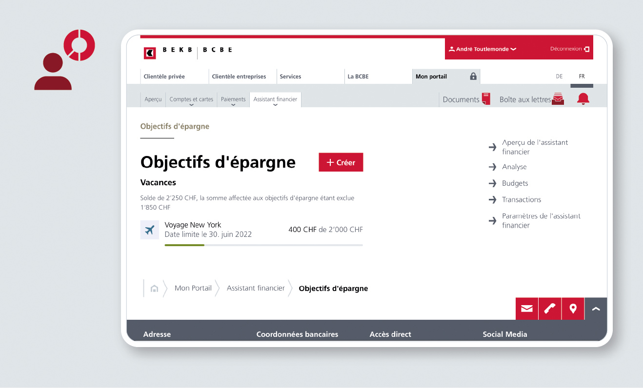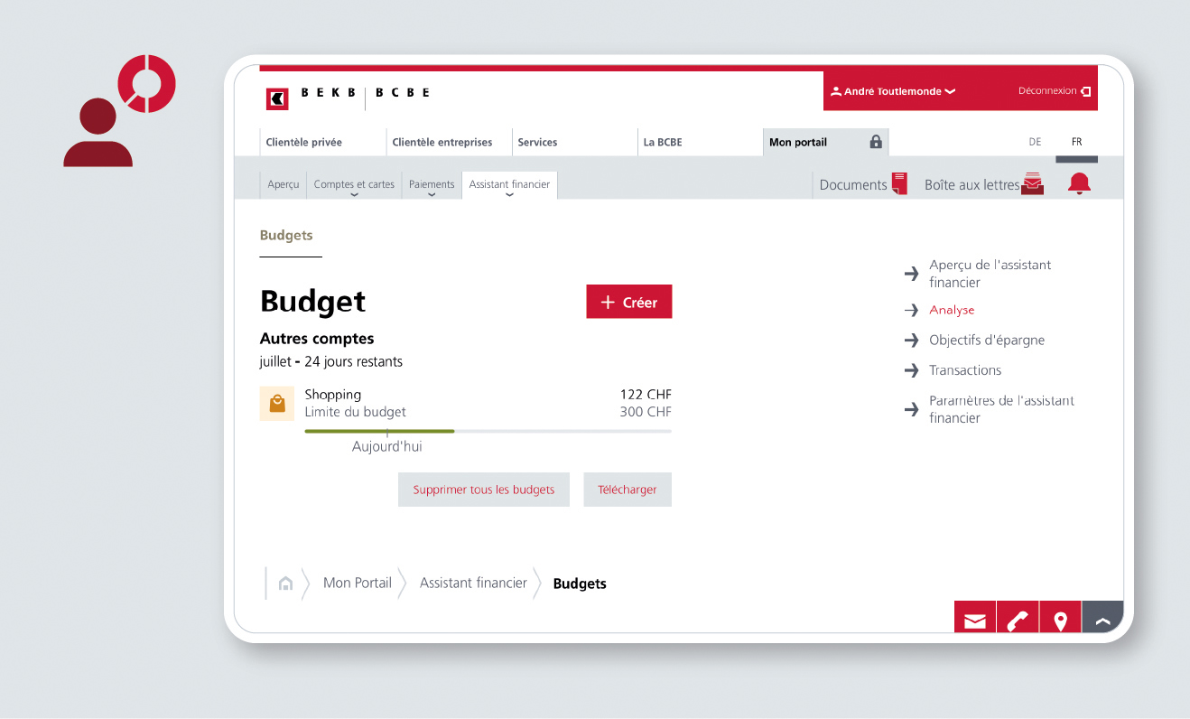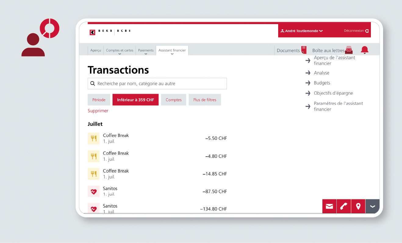 L’assistant financier pour la Clientèle privée vous permet de gérer vos finances à votre guise. Vous pouvez par exemple établir un budget pour différents types de dépenses et identifier de cette manière votre potentiel d’économies. Par ailleurs, vous pouvez configurer l’assistant financier afin qu’il vous avise lorsqu’une entrée d’argent importante est susceptible d’avoir des répercussions non négligeables sur votre charge fiscale. Nombreuses sont les fonctions de l’assistant financier, à vous de sélectionner les informations que vous souhaitez recevoir.