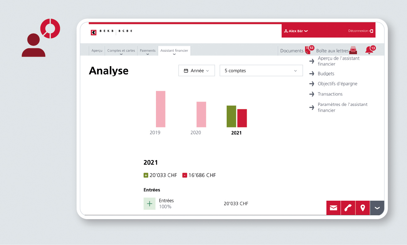 | Accès | Pour utiliser l’assistant financier, vous avez besoin d’un accès à l'e-banking de la BCBE. Si vous ne possédez pas encore d’identifiants, vous pouvez les demander par téléphone au 031 666 18 85. |